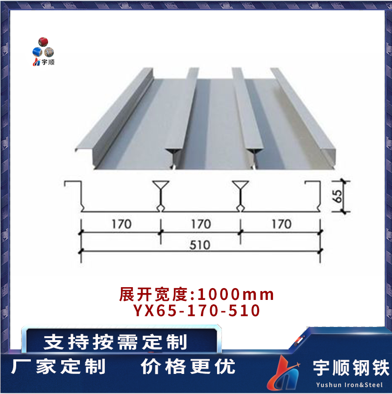第三代閉口樓承板:考慮到以上的問題,一些設計人員在原有的樓承板面上增加剪力槽,通過混泥土包裹作用使二者共同受力,增加樓板的強度,不僅可以使樓承板與混泥土成為一個整體還可以節省部分受拉鋼筋。從而大大降低了工程造價,經過設計人員的改良,第二代閉口、縮口樓承板漸漸替代了第一代開口樓承板。包括YXB65-185-555、YXB66-240-720、YXB65-170-510、YXB46-200-600、YXB40-185-740。